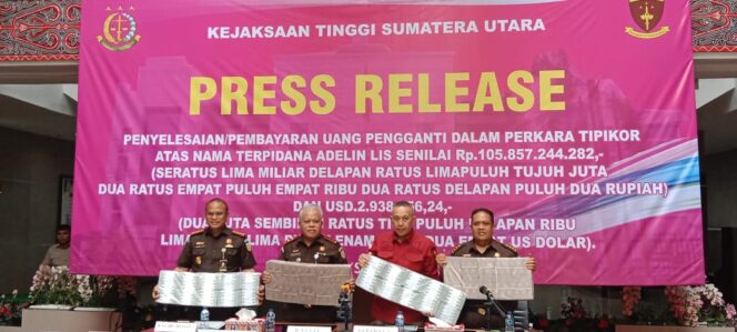 Medan,PostSumatera.id – Sebagai upaya dan dalam rangka memulihkan keuangan negara dari penanganan tindak pidana, Kejaksaan melalui Jaksa Eksekutor melaksanakan eksekusi terhadap uang pengganti atas kerugian keuangan negara yang dilakukan terpidana Adelin Lis dan berhasil menyetorkan ke kas negara sebesar sebesar Rp105.857.244.282,4 (seratus lima miliar delapan ratus limapuluh tujuh juta dua ratus empat puluh empat rupiah) dan uang dalam mata uang asing sebesar US$ 2.938.556,4, yang dilakukan keluarga terpidana kepada Jaksa yang dilaksanakan di kantor Kejaksaan Tinggi Sumatera Utara,do Jalan Jeneral Besar AH Nasution Medan, Rabu (3/9/25).